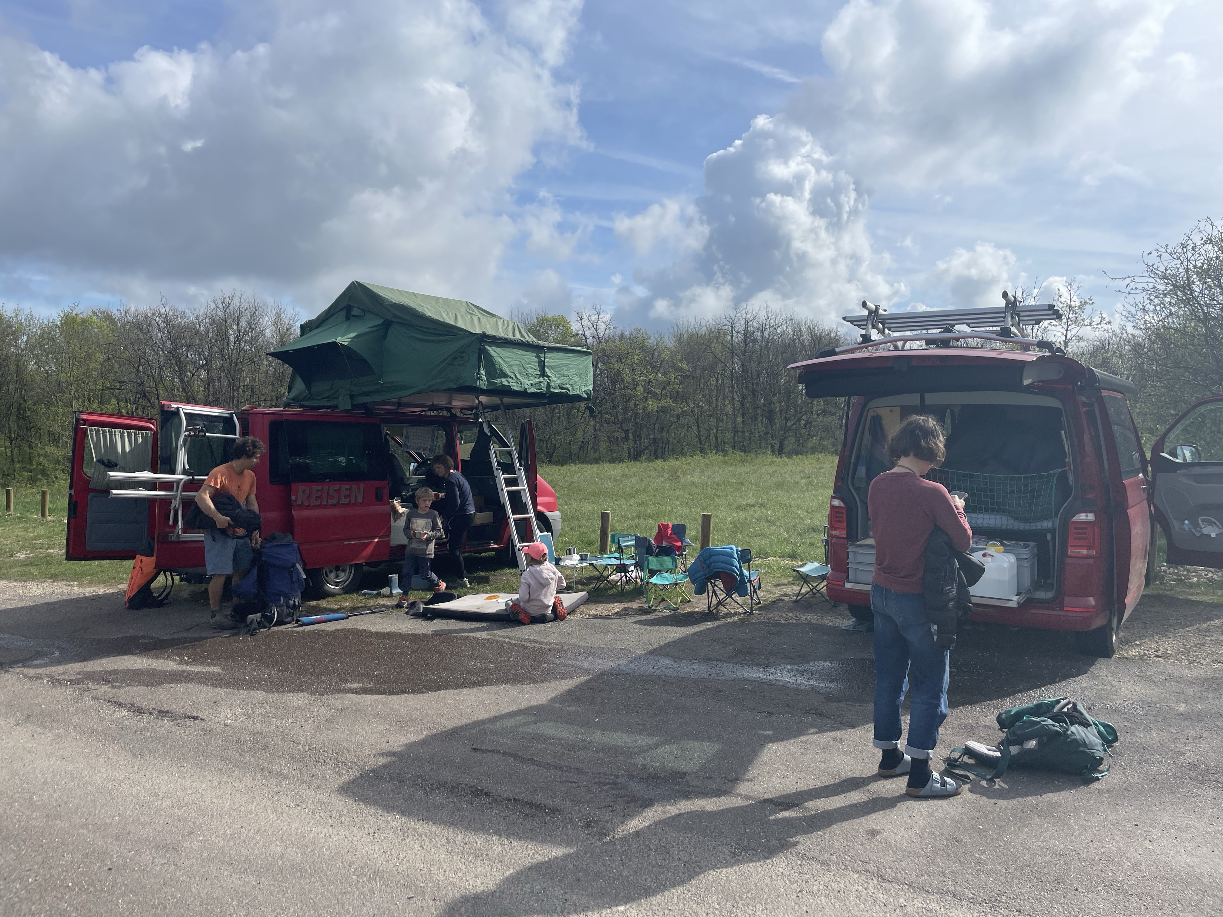 Ein Jahr später: April und Paul stehen vor unserem Ferienhaus in Achères-la-Forêt mitten im Wald von Fontainebleau. Aus ihren Kindern Ivan und Silas sind zwei grosse süsse Jungs geworden, mit Haaren wie Chris Sharma. Wir fangen da an, wo wir aufgehört haben: das Kletterleben geniessen und das beste aus jedem Tag herausholen.